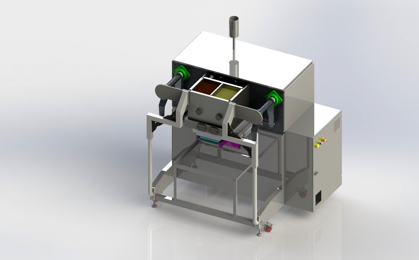 İki ayrı servo motorla çalışan, krema ve çikolatayı aynı anda dökebilen, ±%2 hassasiyetle dozajlama yapan PLC kontrollü one-shot depozitör.